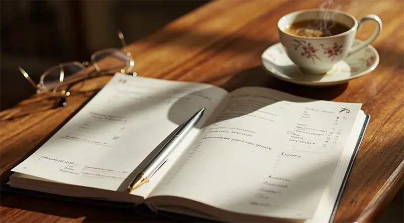 책상 위에 따뜻한 차 한 잔과 노트, 볼펜, 안경이 놓여 있는 이미지.