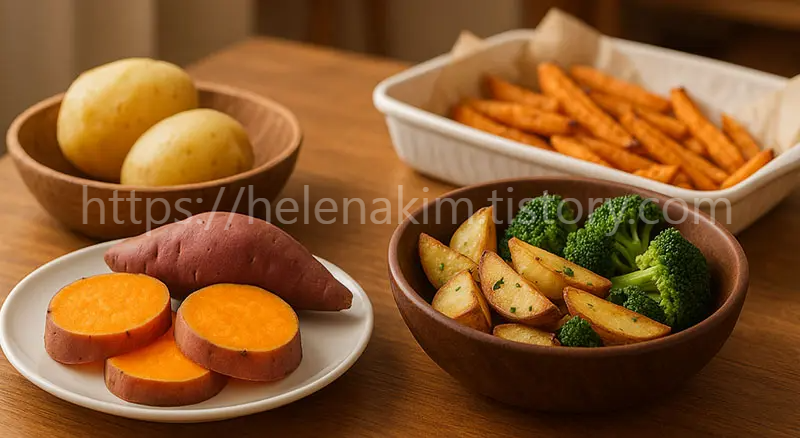 • 고구마와 감자를 격일로 번갈아 섭취하거나, 다양한 **탄수화물 식재료(귀리, 현미, 퀴노아 등)**함께 조합하면 좋습니다.