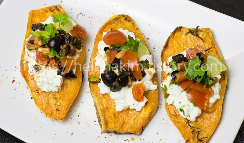 하얀 접시에 담긴 슬라이스 고구마에 크림치즈와 올리브, 토마토를 올린 고구마 간식.