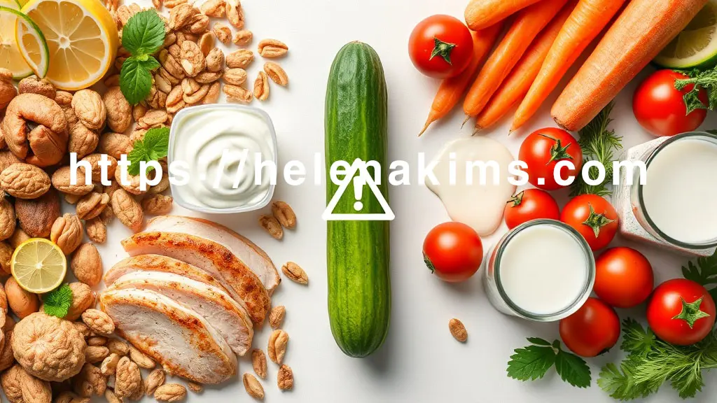 중앙에 신선한 오이가 놓여있고, 왼쪽에는 오이와 궁합이 좋은 신선한 닭가슴살, 요거트, 견과류 등이 밝고 조화롭게 배치되어 건강한 느낌을 준다. 오른쪽에는 섭취 시 주의가 필요한 당근, 토마토, 우유 등이 놓이며, 이들 위에는 은은하게 빛나는 작은 경고 아이콘이 있는 이미지.