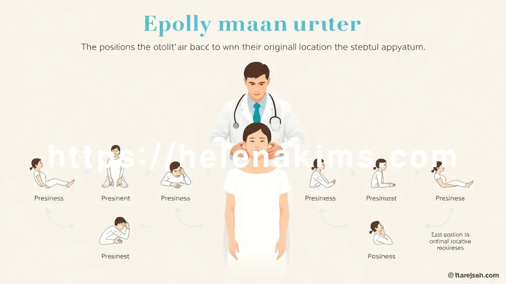 - 에플리 수기란? 환자의 머리를 약 4단계에 걸쳐 특정 방향으로 움직여 이석을 이동시키는 방법입니다. 각 자세에서 약 30초에서 1분 정도 유지하며, 이석이 움직이는 동안 어지럼증이 유발될 수 있습니다.