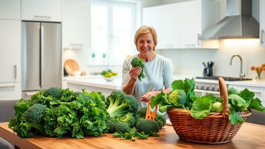 녹색 잎채소는 비타민K의 주요 공급원이며, 비타민K는 칼슘 흡수를 돕고 뼈를 튼튼하게 하여 골밀도를 유지하는 데 필수적입니다. 중년 이후 골다공증 예방에 큰 도움이 됩니다.