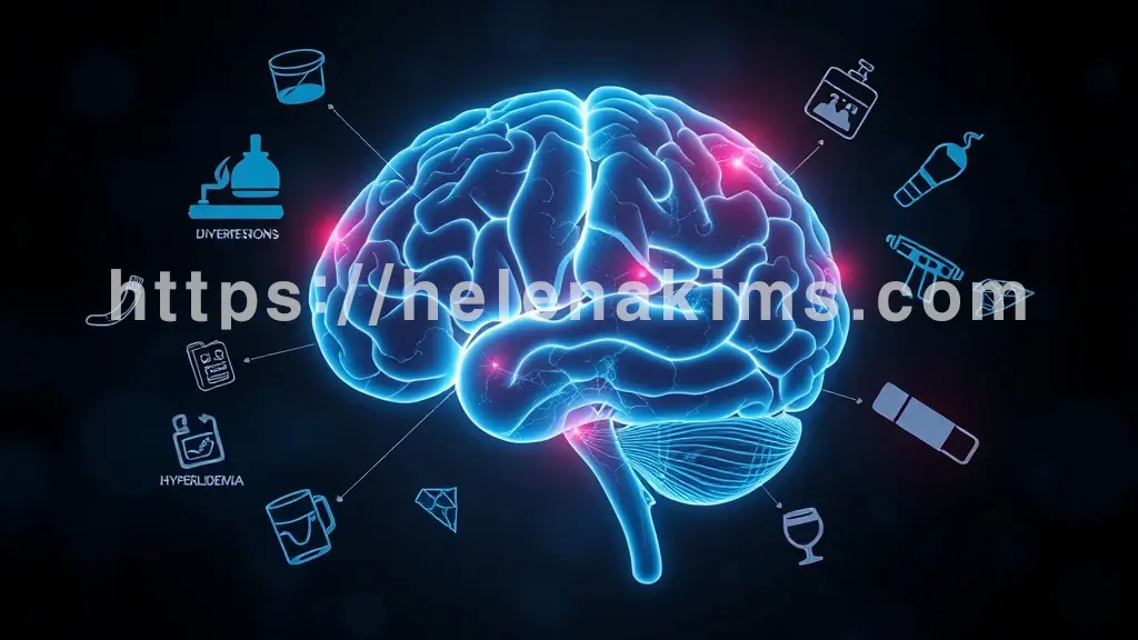 인간 뇌의 투명한 실루엣 중앙에 빛나는 뇌혈관망이 복잡하게 얽혀 있고, 일부 뇌 단면에서 MRI/CT 스캔 이미지가 오버레이. 뇌 주변으로는 약병, 혈압계, 혈당 측정기 등 만성 질환 관리 도구 아이콘들이 떠다닙니다.