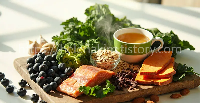 연어, 통곡물 등의 건강한 식단.